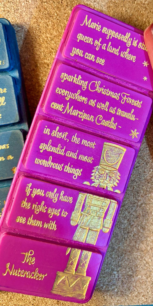 Step into the magical world of The Nutcracker with our enchanting bookish wax melt bars. Inspired by E.T.A. Hoffmann’s classic festive tale, these melts are the perfect gift for lovers of whimsical stories, Christmas nostalgia, and timeless imagination. Whether you're searching for a unique literary gift or simply want to fill your home with the warmth and wonder of a Christmas Eve adventure, these wax melts bring the charm of Hoffmann’s beloved story to life.