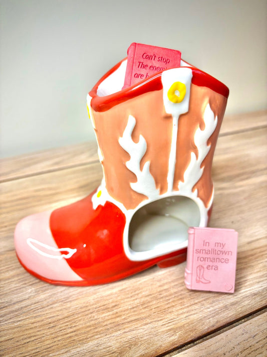 Our collection of wax melt burners is designed to elevate your reading experience with style and sophistication. Whether you prefer modern aesthetics, country charm, or a touch of cowboy romance, our burners suit every taste. Crafted to complement your next read, they’re as functional as they are beautiful, offering a stylish way to enjoy your favourite fragrances to match the mood of your book.