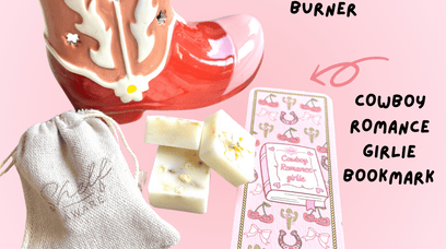 The Cowboy Romance Girlie Gift Set is the book gift made for readers in their cowboy romance era. It features a pink, feminine bookmark filled with charming cowboy details, a pouch of our popular Saddle and Sun wax melts, and a ceramic cowboy boot wax melt burner. The perfect book gift for your book bestie!