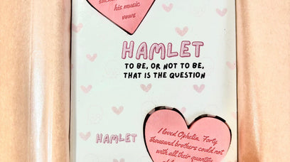 Hamlet and Ophelia’s love is a turbulent tide, pulled somewhere between deep affection, heartbreaking uncertainty and unwavering loyalty. Their bond is apparent, but it is fragile and they are ultimately too stubborn, too inactive and too late. Caught between Hamlet’s inner turmoil and Ophelia’s devotion, they are both swept away in a tragic spiral without any peace or resolution. One of Shakespeare's most famous tragedies, studied and celebrated worldwide, this story teaches us about honesty and to action love and we certainly do so with this gift box, with a dash of humour for good measure!
