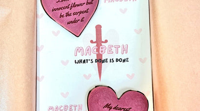 You have found the perfect book lover Shakespeare Gift! Nestled in our beautiful packaging you'll find two intricately crafted love heart wax melts made from a creamy rapeseed and coconut wax, representing the beguiling nature of the infamous couple from Macbeth and the mysterious darkness that they each beckon. Each wax melt is thoughtfully adorned with a quote to showcase their ambitious, conniving relationship perfectly. This enchanting gift box has you stepping into a world of duplicity, darkness and disloyalty with one of Shakespeare's most infamous couples.