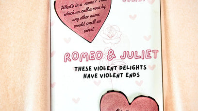 You have found the perfect book lover Shakespeare Gift! Nestled in this beautiful box, you'll find two intricately crafted love heart wax melts, made from a sustainable rapeseed and coconut wax, each one thoughtfully adorned with a famous line from the ill-fated young couple. These charming wax melts evoke the awe and magic of Romeo and Juliet and their unforgettable love story, making them a truly unique and personal gift for any Shakespeare fan.