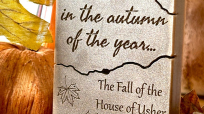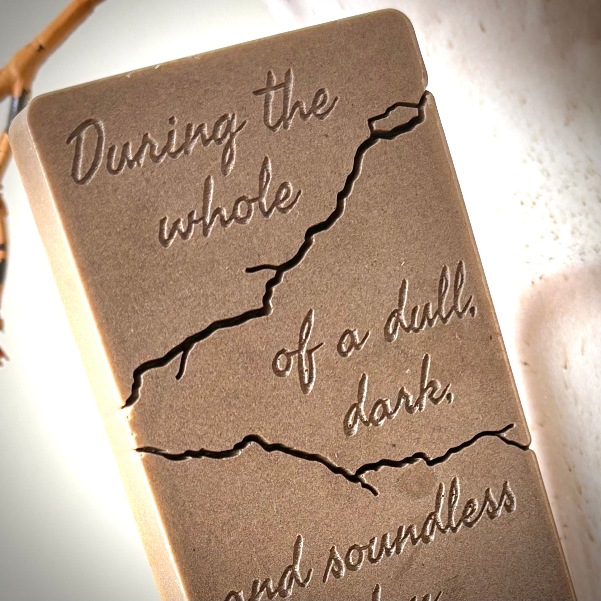Each segment features the haunting opening sentence from the story, delicately etched to capture the chilling mood of Poe’s masterpiece. Cracks running through the bar symbolise the decay and mystery of the Usher estate, while shimmery wax and gothic writing creates a perfect blend of haunting elegance and autumnal atmosphere.