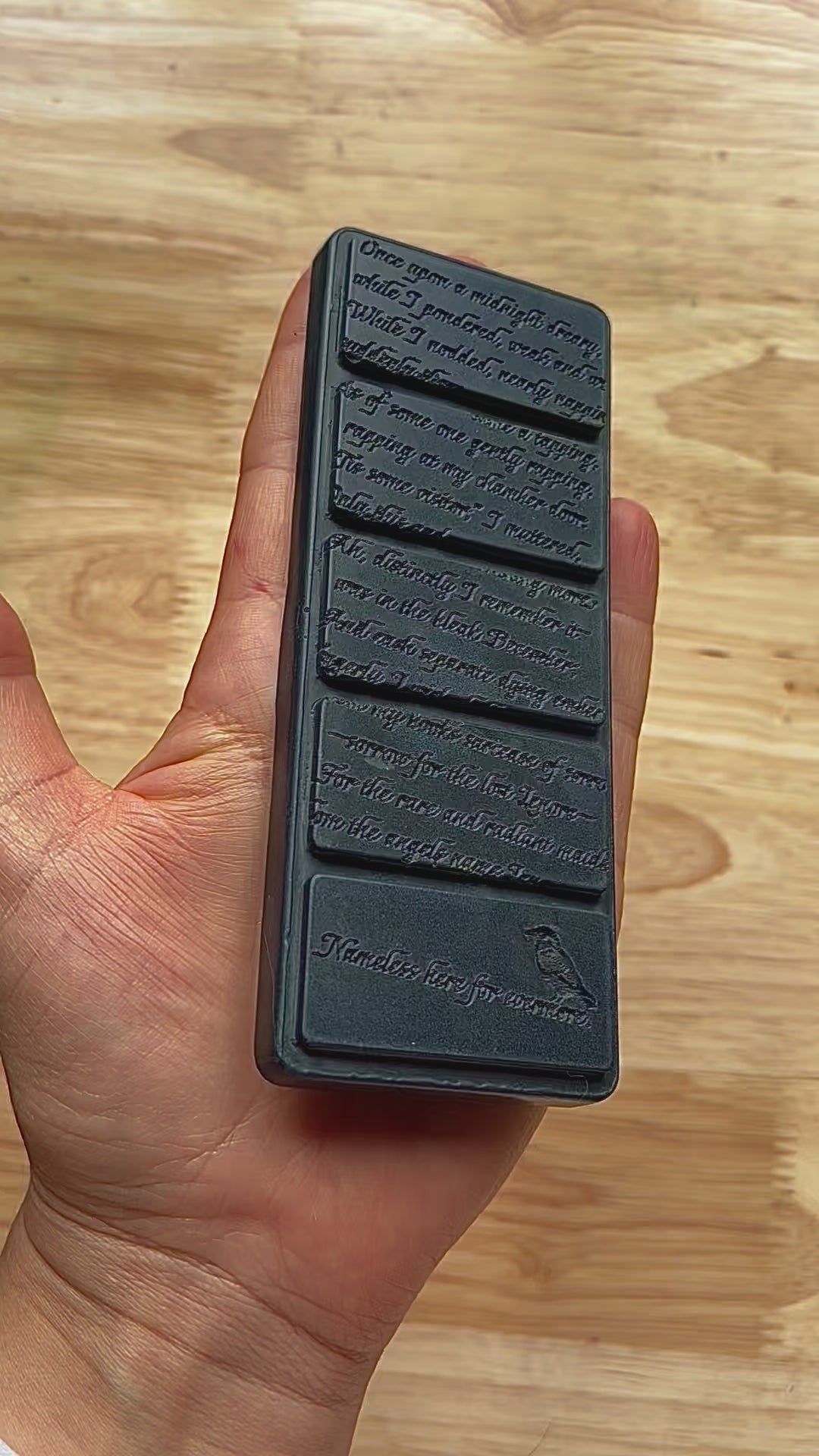 Every inch is a tribute to the gothic elegance of Poe’s words; mysterious, melancholic, and completely spellbinding. Whether you melt it on a stormy evening or display it as part of your literary collection, this bar brings the chilling beauty of The Raven to life in a way that’s tactile, visual, and unforgettable.