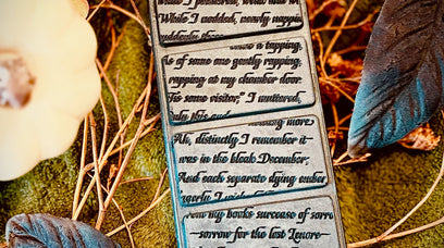 Dark, beautiful, and utterly captivating. This wax melt bar is a true homage to the haunting genius of Edgar Allan Poe's The Raven. Hand-poured in a dramatic, midnight, sparkling, black using a luxurious blend of rapeseed and coconut wax, this wax melt bar is intricately detailed with lines from Poe’s iconic poem splayed across the surface.